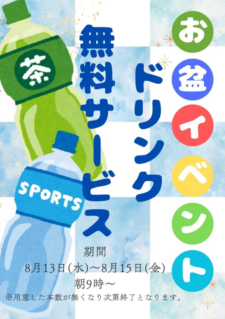 お盆期間の8月13日~15日はドリンク無料サービスを実施いたします。